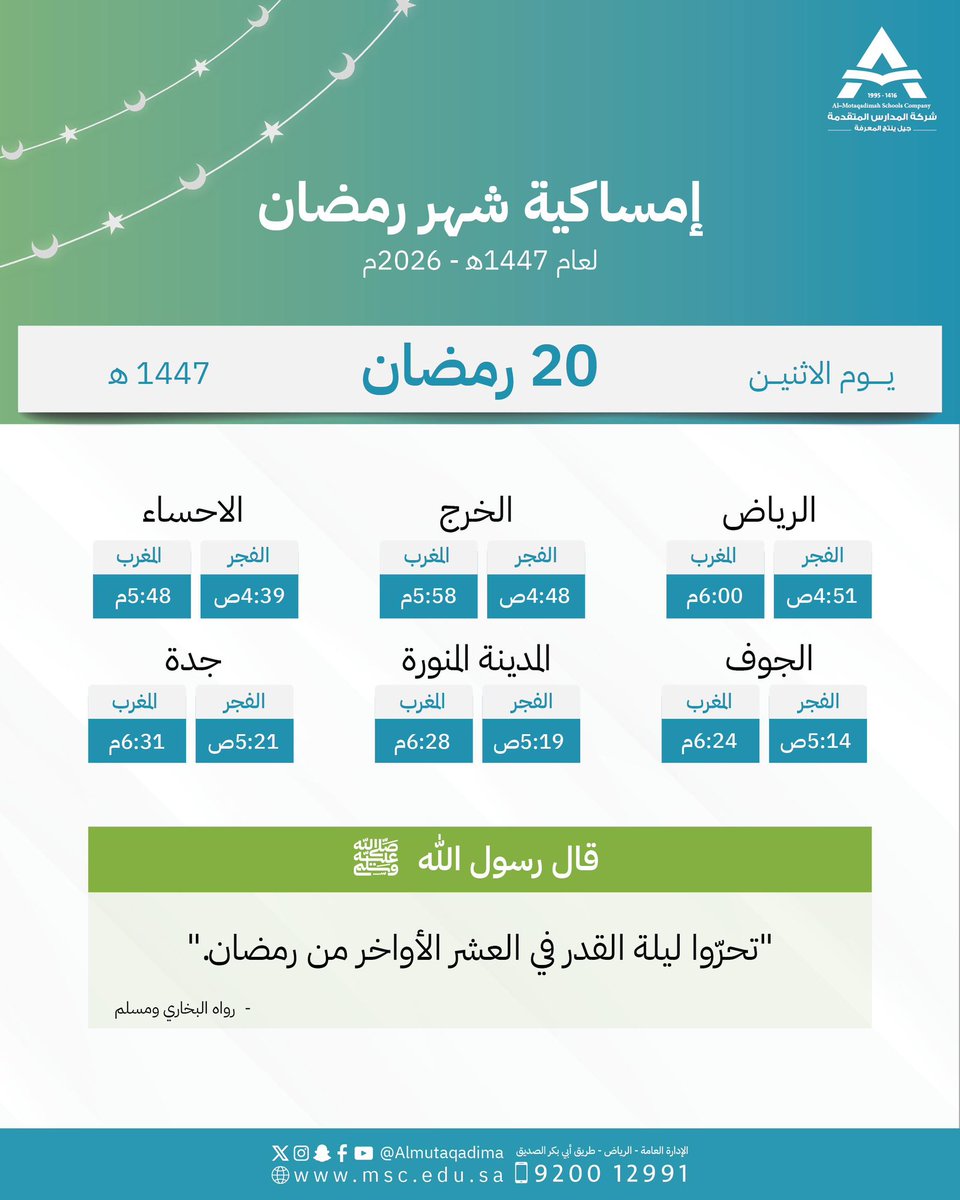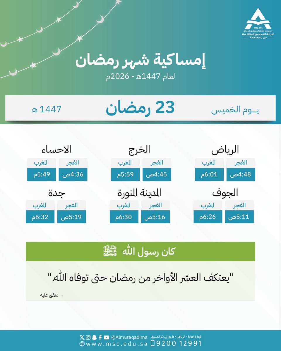 إمساكية يوم ٢٣ #رمضان 1447هـ 🌙نسأل الله أن يتقبل منا ومنكم الصيام والقيام وصالح الأعمال.