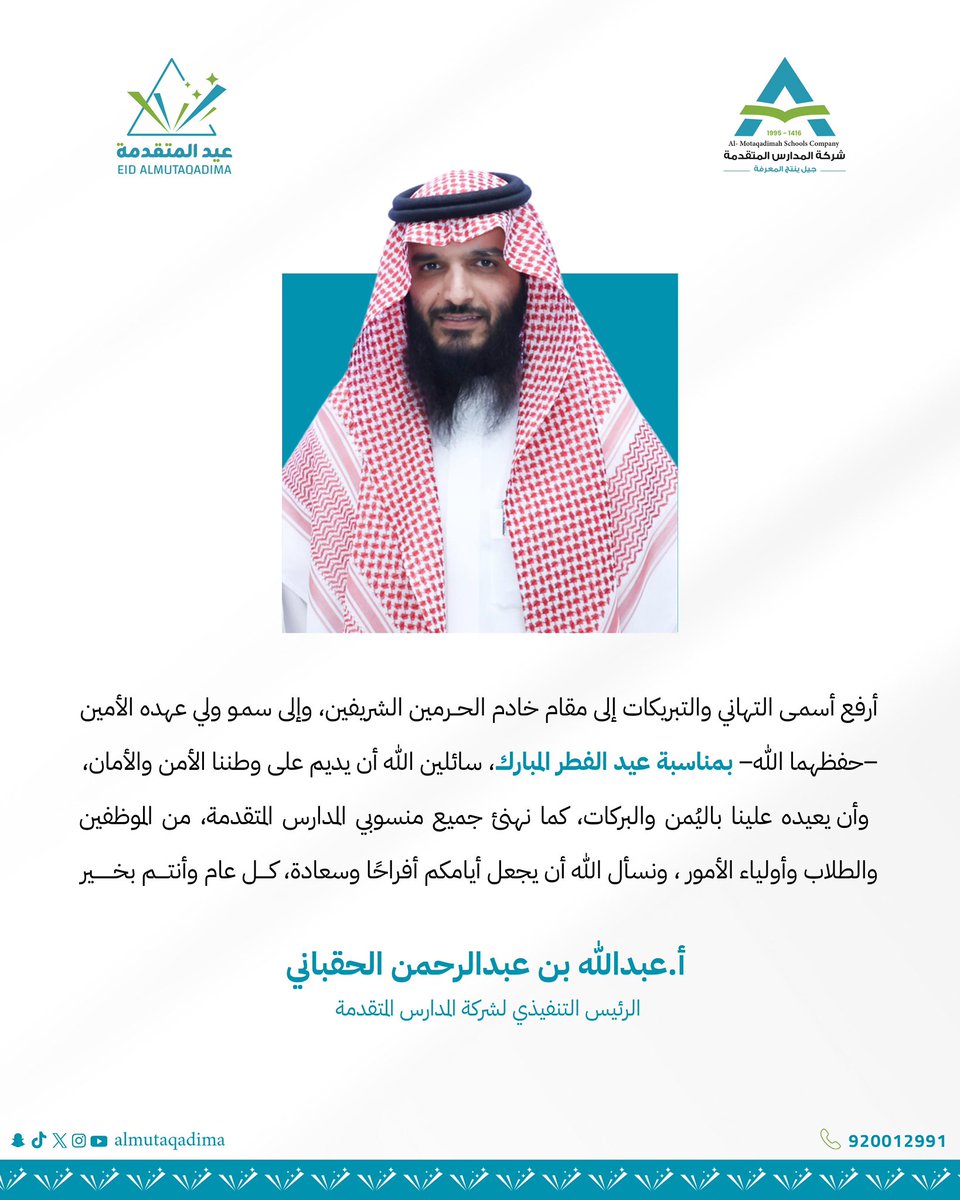 أرفع أسمى التهاني والتبريكات إلى مقام خادم الحرمين الشريفين ، وإلى سمو ولي عهده الأمين – حفظهما الله – بمناسبة #عيد_الفطر_المبارك ، سائلين الله أن يديم على وطننا الأمن والأمان، وأن يعيده علينا باليُمن والبركات.