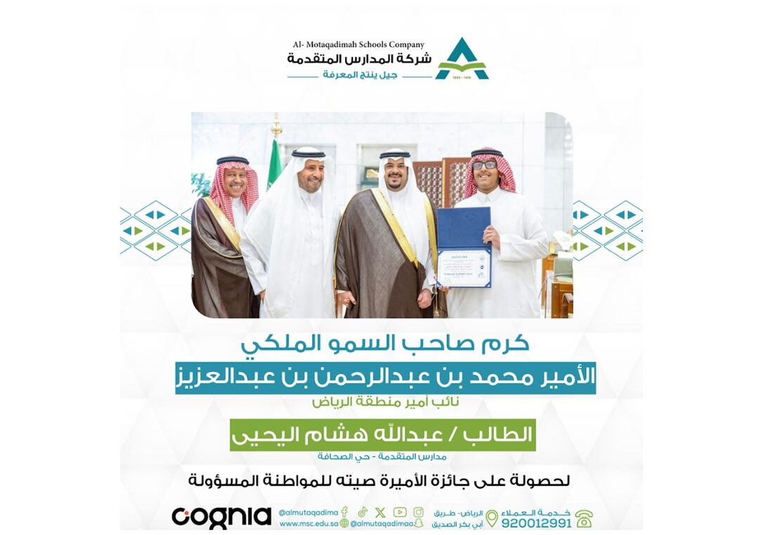 نائب أمير الرياض يكرّم الطالب عبدالله هشام اليحيى من “مدارس المتقدمة الصحافة ” لحصوله على جائزة الأميرة صيتة للمواطنة المسؤولة يونيو 17, 2025 أقرا المزيد »