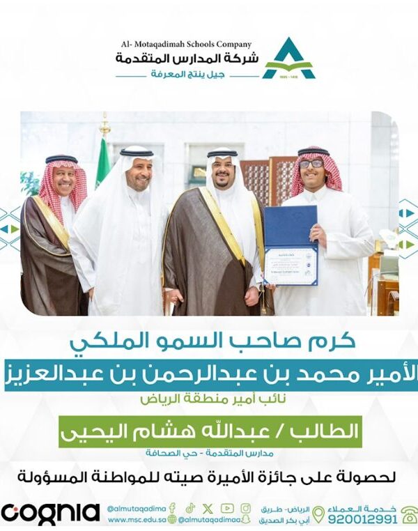 نائب أمير الرياض يكرّم الطالبة رندة الشهري من “مدارس المتقدمة للتعلم الذكي ” لحصولها على جائزة الأميرة صيتة للمواطنة المسؤولة