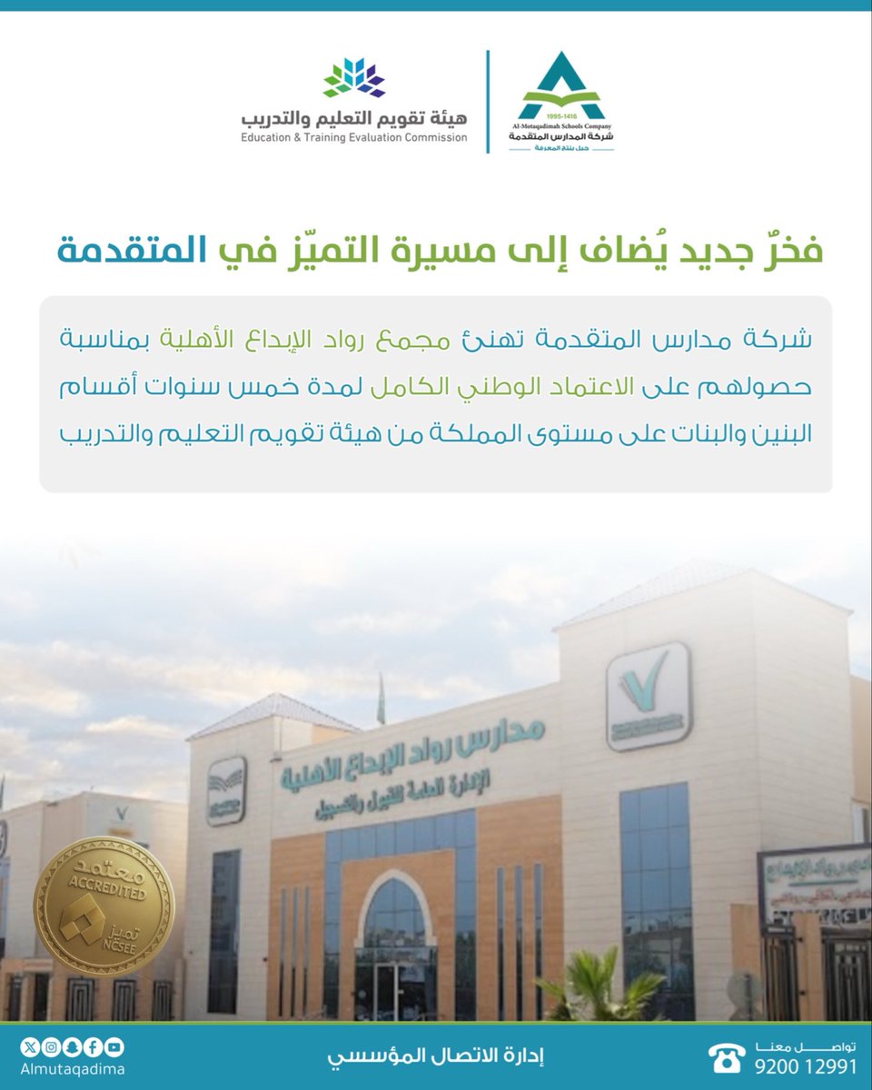 شركة #مدارس_المتقدمة تهنئ مجمع رواد الإبداع الأهلية بمناسبة حصولهم على الاعتماد الوطني الكامل لمدة خمس سنوات أقسام البنين والبنات على مستوى المملكة من هيئة تقويم التعليم والتدريب